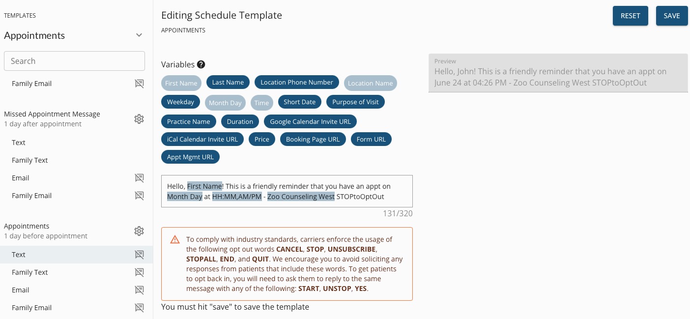 - A preview example will display on the right. Click SAVE when you are happy with your message. To return to the default message, click RESET.