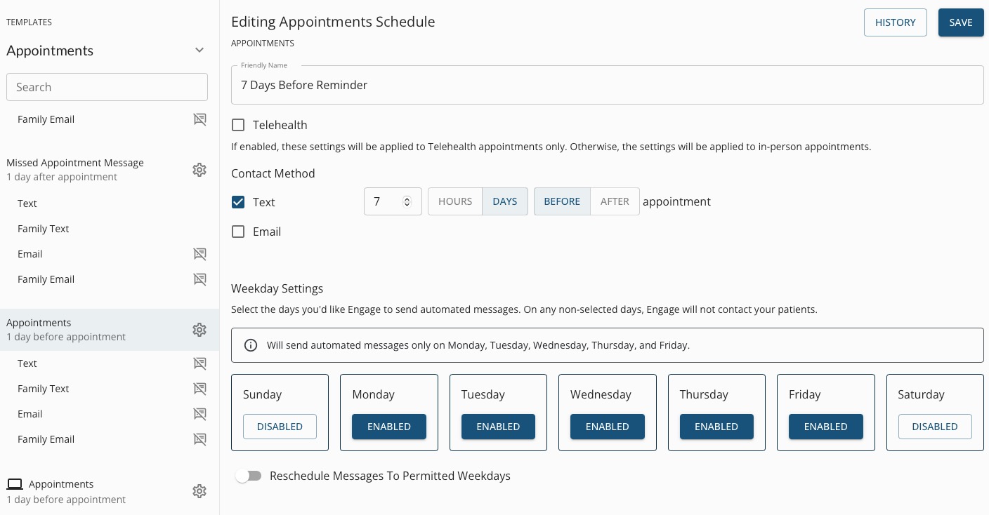- Under Weekday Settings, click the Enabled button under any day of the week you do NOT wish for this message to send, such as Saturdays and/or Sundays. The label under the selected days will change to Disabled.