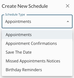 - If you need to add a new Appointment Reminder, click Create New Schedule, then select Appointments from the Schedule Types dropdown menu.