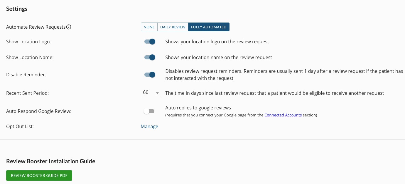 - Auto Respond Google Review: if toggled ON, clients who give Google reviews will receive rotating automatic responses from your practice. Your practice can customize these responses in Templates → Review Management. To learn more about auto-responses, click here.