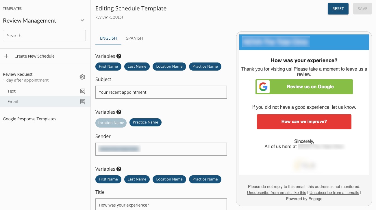 Note: The Review Site Buttons variable in the email template is linked to your public review sites, such as Google and Facebook. Click here to learn more: Engage - Add Public Review Site URLs.