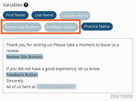Do not remove the Request Link, Review Site Buttons or Feedback Button variables; these allow your clients to initiate their reviews. To see all public review sites supported by Engage, click here.