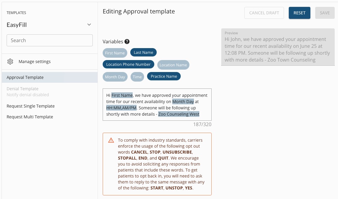 EasyFill sends text messages to clients alerting them to openings in your schedule. Customize these messages for your practice.