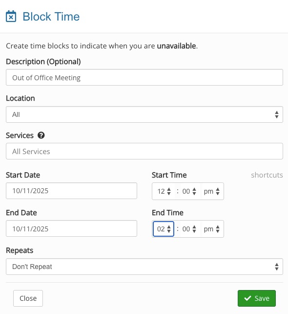 Shortcut: To quickly block availability in your calendar, you can open the dialog above by pressing and holding the Shift key while clicking on the day/time you want to block in your calendar.