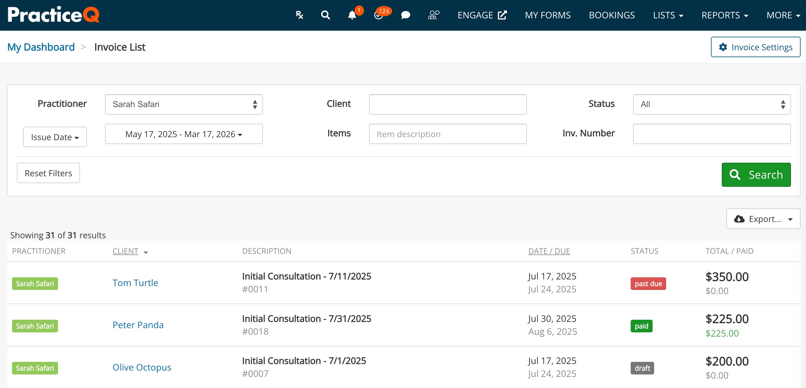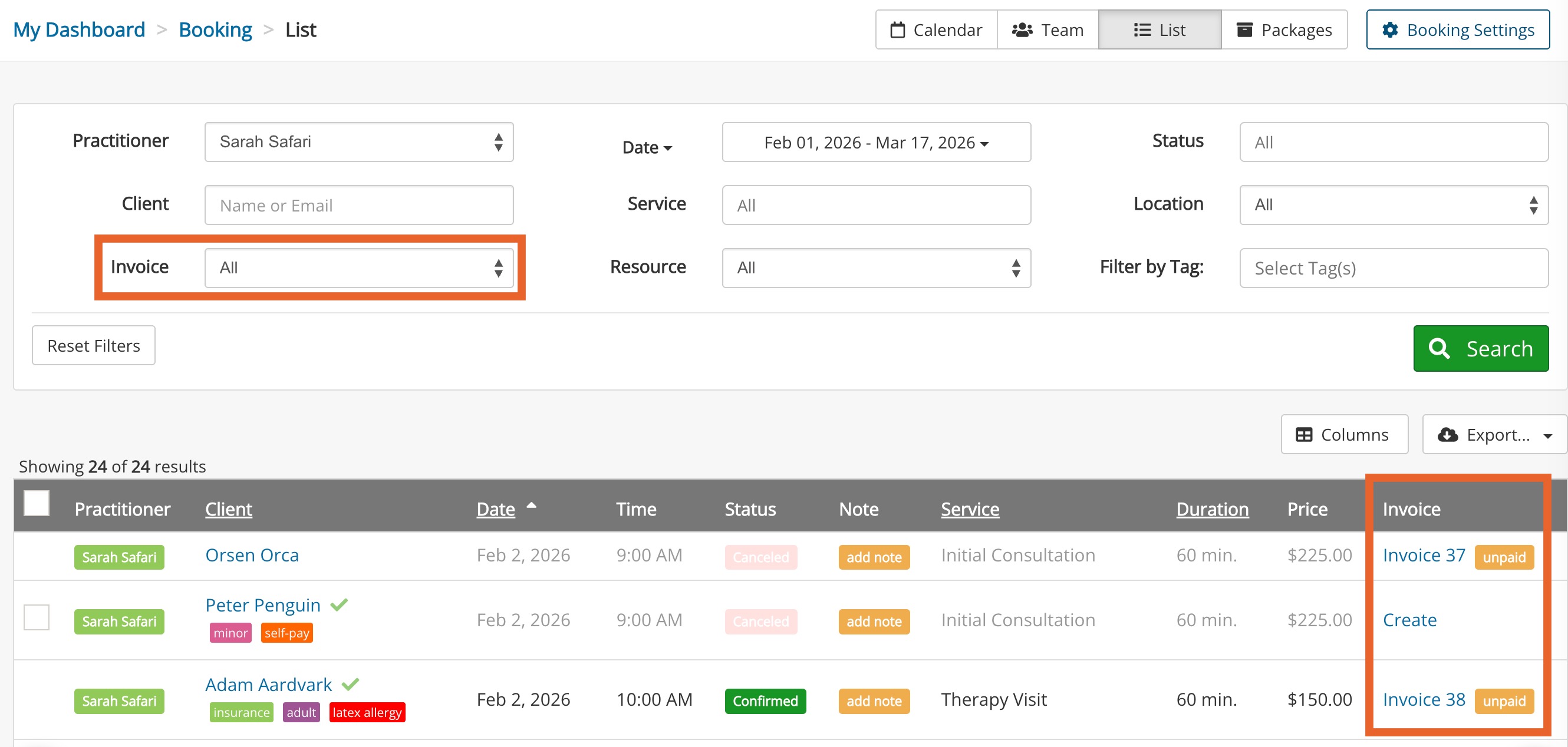 - Appointments List: This page allows you to manage invoices based on appointments. You can search for appointments that have not been paid or invoiced using appointment filters such as Date, Service, Location, and Practitioner. To access this page, click Lists → Appointments.