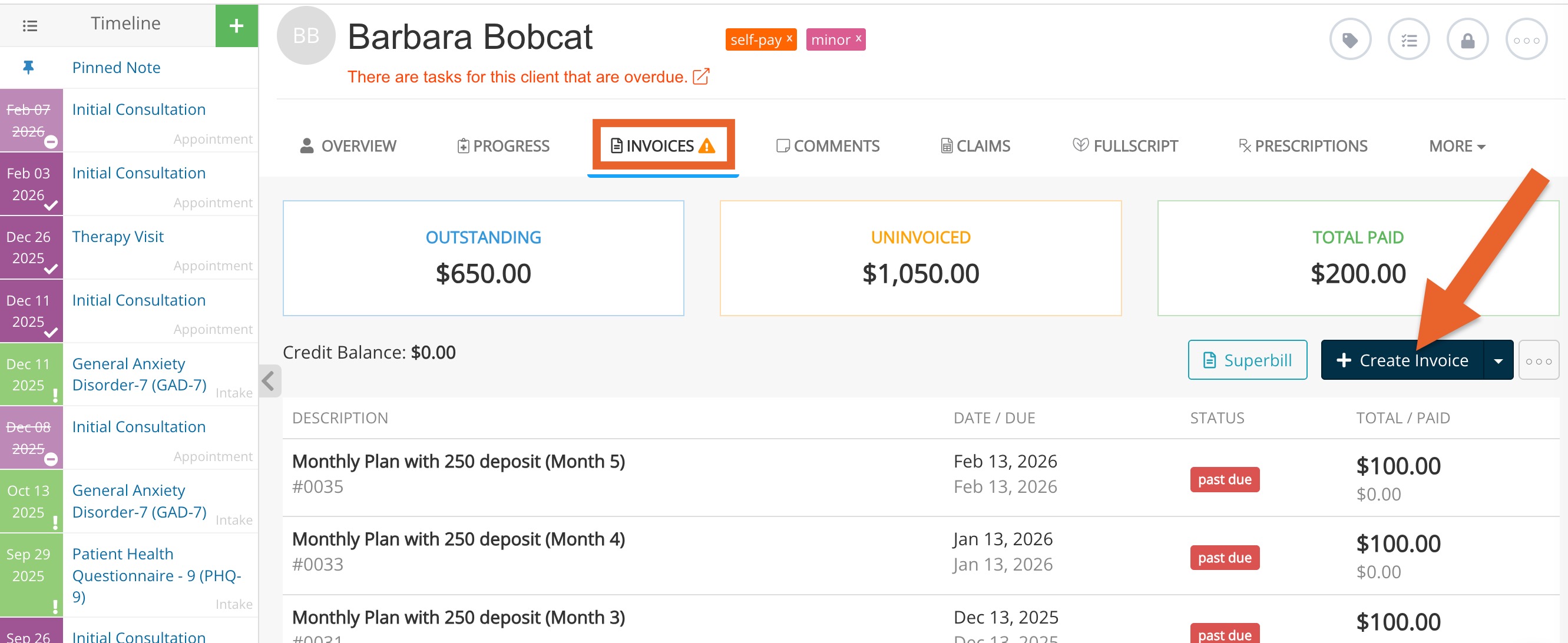 - Client Profile: The Invoices tab in a client's profile will show you all the invoices for that particular client. You can also create new invoices for that client and see their total balance.