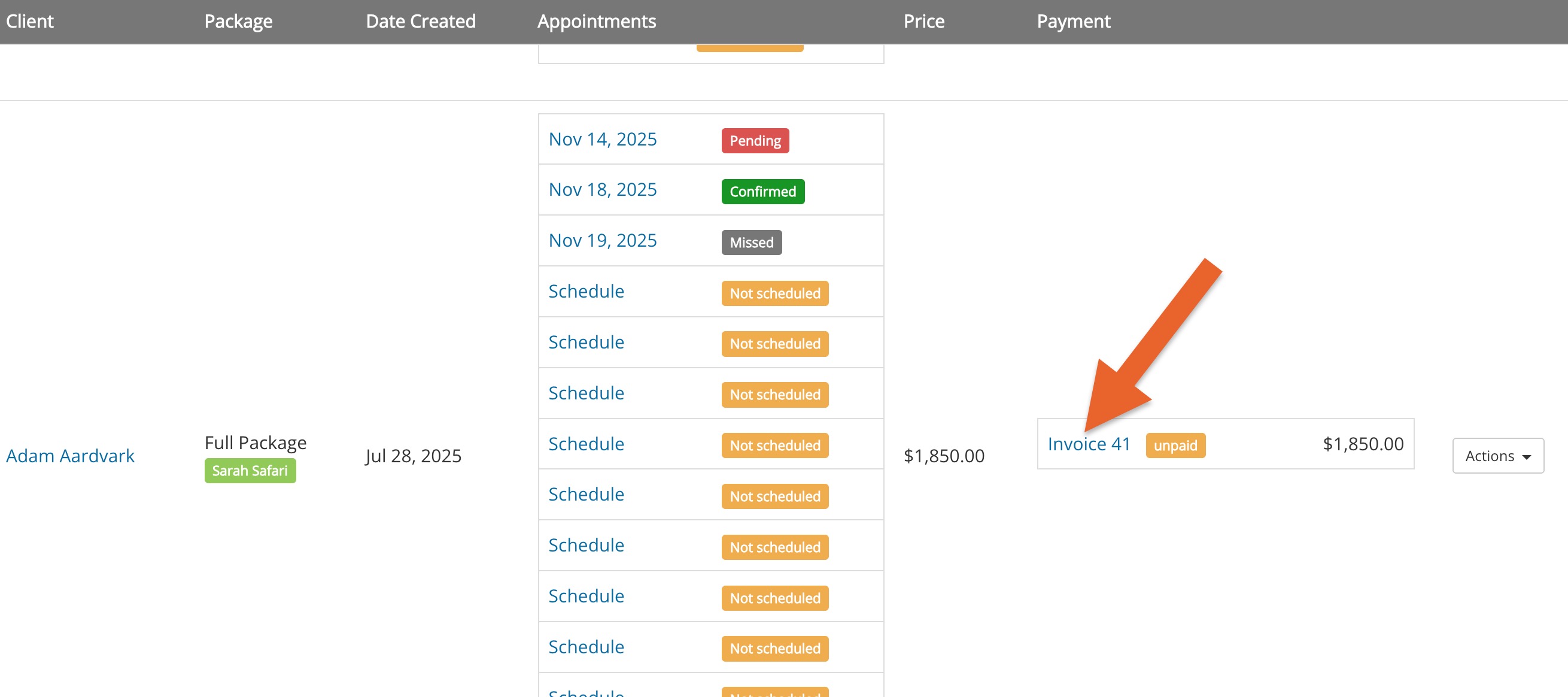 - Packages List: Similar to the above, you can manage invoices based on packages. To access the Packages page, click Bookings → Packages.