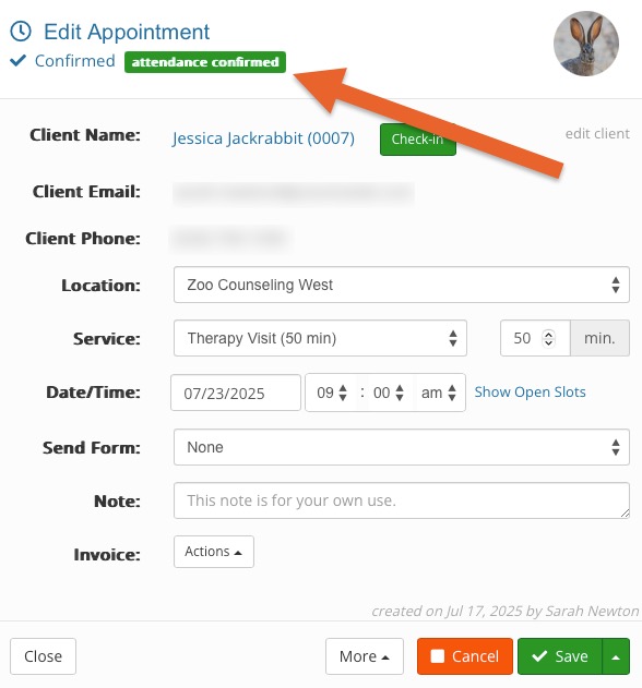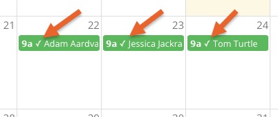 - Once the appointment is confirmed by the client, it will appear with a check mark on the Bookings calendar and a green attendance confirmed tag in the Appointment Dialog.