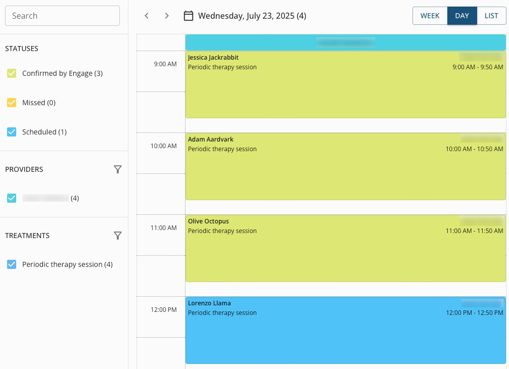 - Once the appointment is confirmed by the client, it will appear light green in Engage → Appointments → Schedule.