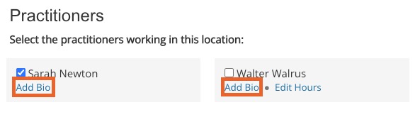 - Click the Add Bio or Edit Bio link below each practitioner name.