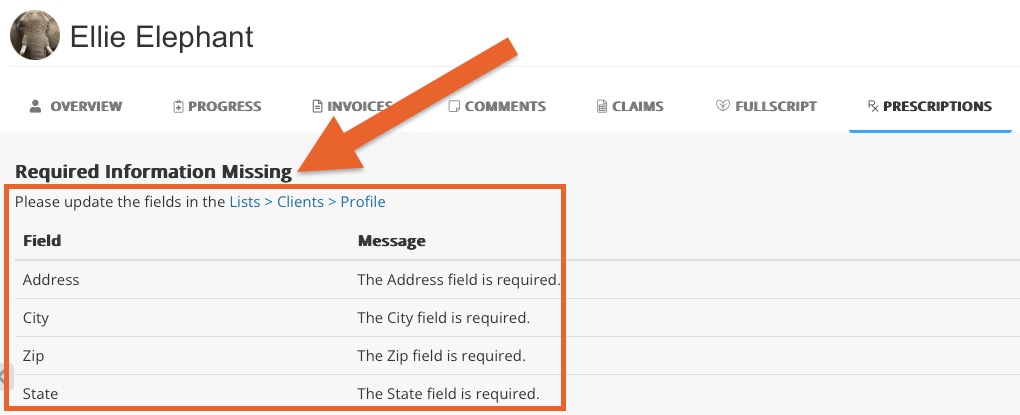 Note: If any of these fields are missing, the client cannot be added via merge or interfaced successfully. If a client is missing information, you will receive a message when you select their Prescriptions tab.
