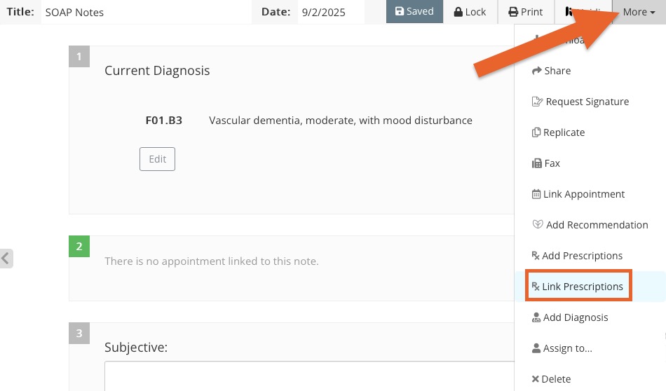 - Click the Link button to link one or more of the prescriptions to the Treatment Note.