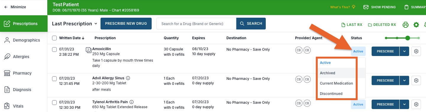 - If you do not want to see duplicate medications in the list, change the statuses of the prescriptions to remove them from your chosen view.