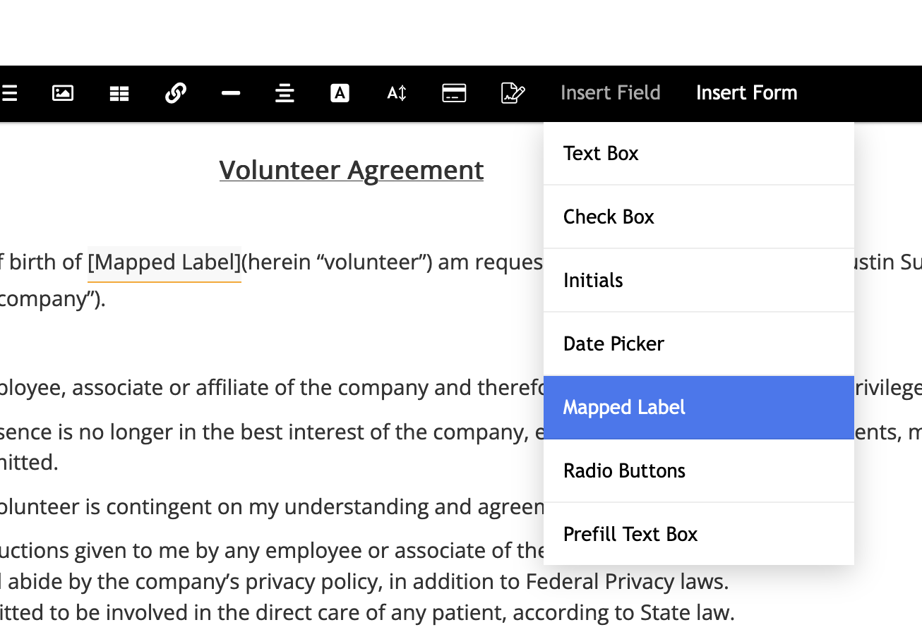 - Click Insert Field → Mapped Label. (For Native PDF consent forms, click and drag the Mapped Label tool into the document.)