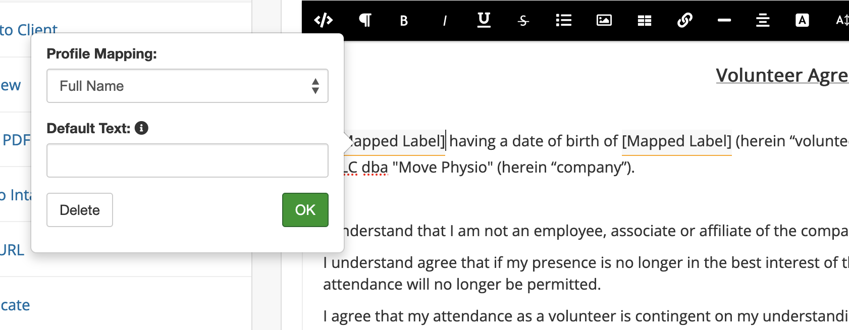 Use mapped labels in your consent forms to populate known information and to minimize staff and client work.